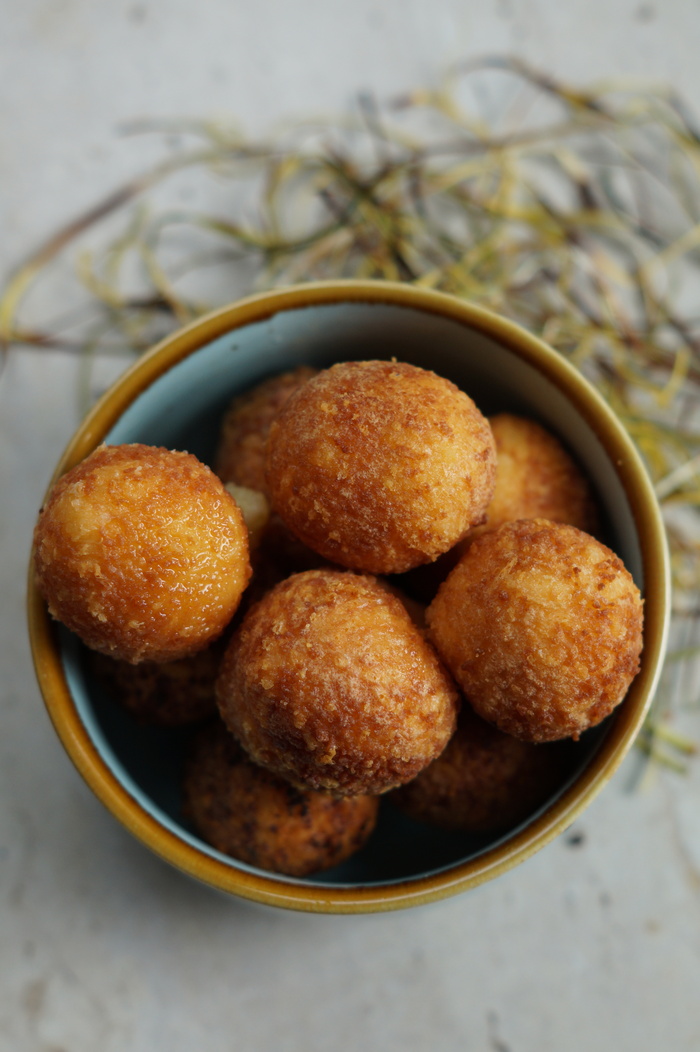 Налила подсолнечное масло в металлический ковшик и дала ему хорошо нагреться. Пока оно грелось я осознавала, что выбрала слишком дорогое для себя блюдо. Чтобы масло покрыло шары, мне пришлось вбухать в ковшик целую бутылку.