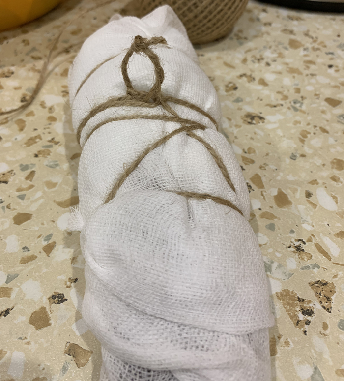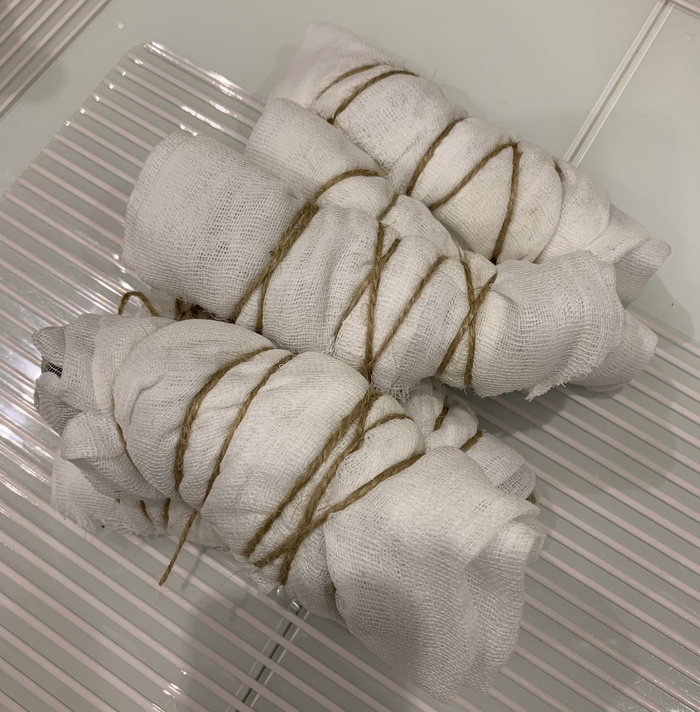 9. Растираем мясо в сосуде с нитритной солью и затем окутываем мясо в медицинскую марлю.