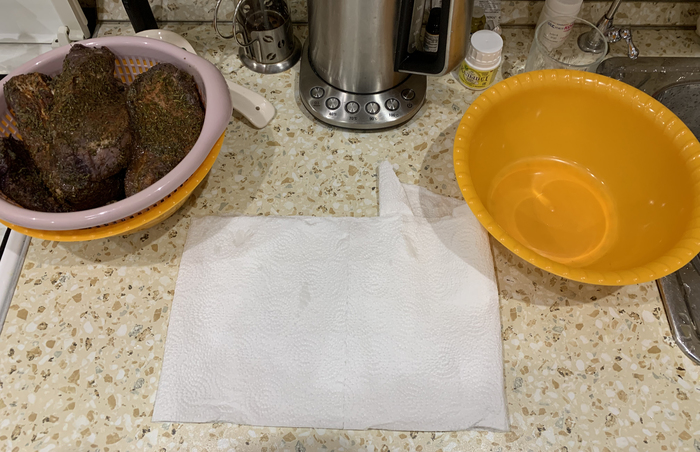 Если нет вакууматора, мясо можно завернуть в пергаментную бумагу и перетянуть его "резинкой для денег" .