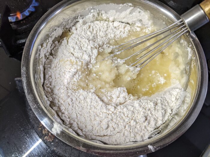 Убавляем огонь, всыпаем муку и быстро перемешиваем. Удобно сначала это делать венчиком.