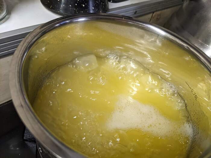 Воду и масло кладем в ковшик и доводим до кипения - таяния масла. Добавляем соль и сахар.