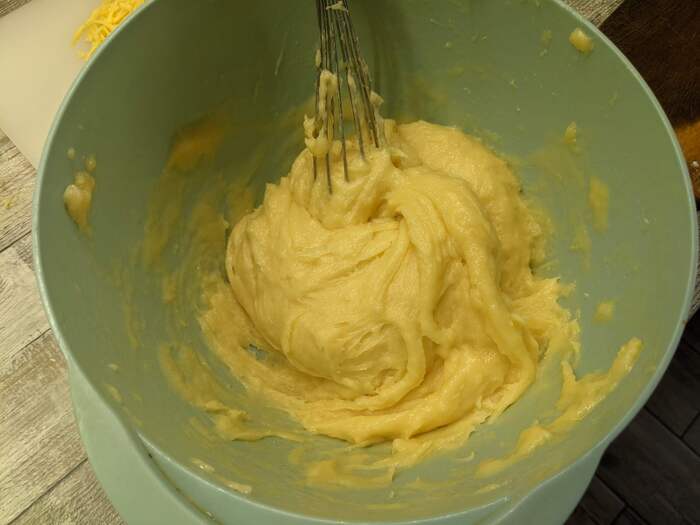С каждым новым яйцом тесто будет терять свою комковатость и становиться все более вязким, тягучим. Нужно примерно вот до такой консистенции его довести. На последних этапах опять беру венчик.