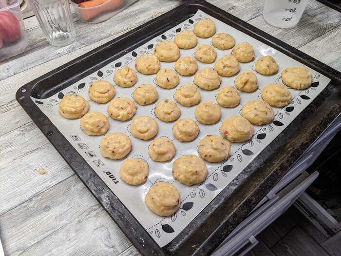 Хорошенько размешали тесто – и в корнет. Очень рекомендую завести в хозяйстве подобную гладкую насадку для него, мне муж напечатал на 3D-принтере, очень выручает: с обычной моей большой насадкой для крема тесто застревает (неоднородоное), а совсем без насадки трудно отсадить ровно, получаются кракозябры. Впрочем, если у вас совсем нет никаких насадок, это фигня, просто берите две мокрые чайные ложки и ими отсаживайте такие плевочки размером с грецкий орех.