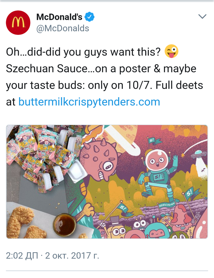 В начале октября в некоторых ресторанах McDonald’s в США на один день вернули сычуаньский соус в меню, но всем фанатам «Рика и Морти» его не хватило. У некоторых заведений сети даже собирались пикеты и их сотрудникам приходилось вызывать полицию.