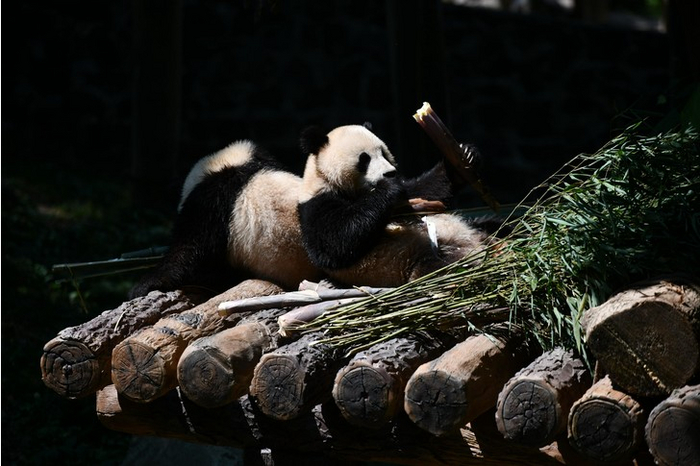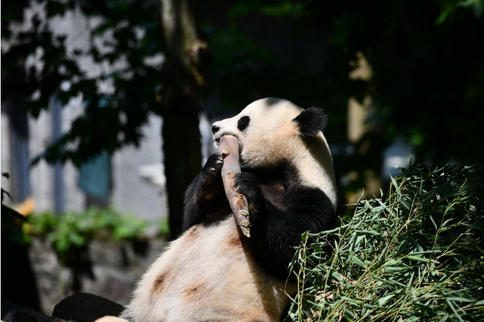 Довольная жизнью панда из зоопарка города Чэнду наслаждается свежими побегами бамбука под тёплыми лучами солнца.