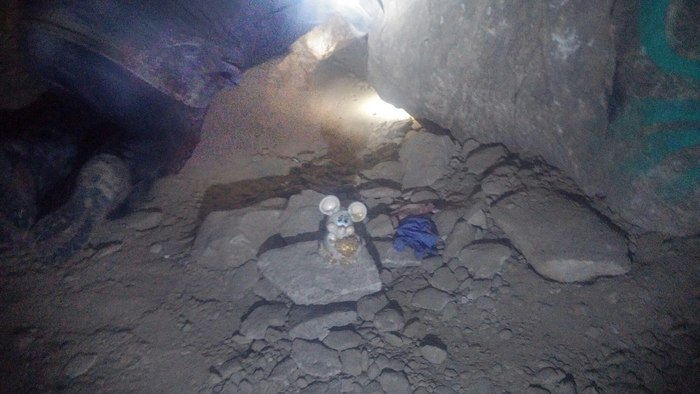 Постараюсь описать как помню. Посреди небольшой площади, под такой, внушающей уважительный трепет табличкой, взору открывалось невиданное нечто. Причем не только само это нечто было удивительное, но и как оно находилось в пространстве, та же самая табличка, буквально все дополняло эту замысловатую картину. С потолка свисали массивные цепи, на которых парила огромная каменная плита, как колыбель призрака, как могильные качели, она парила в воздухе, покачиваясь и тихонько скрепя. И на этой плите покоился сам Аристарх. Вот честно, если бы сказали, что это на самом деле его скелет с тех времен — поверил бы не задумываясь! Говорят когда-то там и правда был череп в противогазе, но сейчас это скорее собранный из символов образ, но с ним следует обращаться также уважительно как с настоящим. Сейчас на ум пришло такое внезапное сравнение — Аристарх напоминает египетских муммий, так же бездвижно покоится, охраняет эти своды, но выглядит очень внушительно и страшно, хочется поклониться и на всякий случай отойти, а то вдруг внезапно восстанет со своей каменной плиты! Вокруг тела обнаружились всякие разные предметы, какие-то красивые, какие-то полезные, веревки, зажигалки, и тд. Это здесь традиция — оставлять дары, которые пригодятся другим путникам или брать оттуда что-то, что тебя выручит. Традиция классная, но место довольно пугающее, если бы я о нем не знал и например случайно наткнулся...