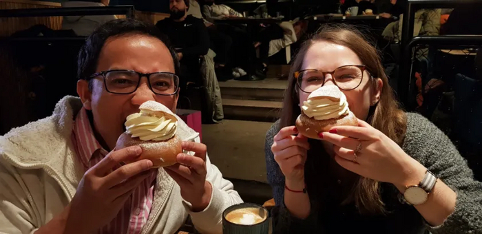 Semlor - вот тут уже с вилкой не объяснить. Это тоже из отдела "если у тебя борода, удачи тебе бро" - съесть и не вымазатся невозможно. Грубо говоря - сладкая булочка из заварного теста, наполненная...заполненная....переполненная до краёв сладким кремом из сливок и миндальной пасты. Если бы она была сделанна как petit-fours французкой традиции на два укуса - было бы загляденье, но шведам они нравятся чем больше тем лучше. И ни разу не видел чтобы их ели вилками или ложками. Однако салфеток никто не отменял, так что может быть я чуток драматизирую )))