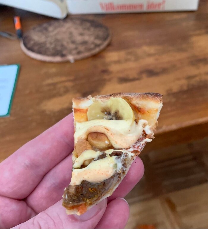 Фото тех пицц которые ввели в раж бедного итальянца не было, но это та которую мне предложили попробовать в следуший раз. Банан...арахис...мазик...кебаб....да что же ты такое?