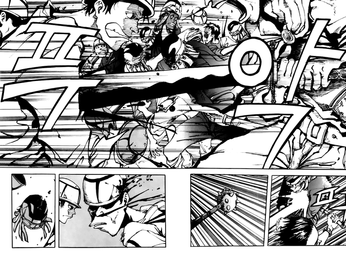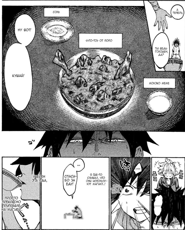 И тут же вылезает главная проблема манги. Очень странно выглядит то, что кочевники несколько поколений живущие в этой степи не развили никаких кулинарных традиций. Ни вяленого мяса, ни кумыса, ни шашлыков. Тупо кидают мясо с овощами в казан хуярят муки и доводят до готовности.