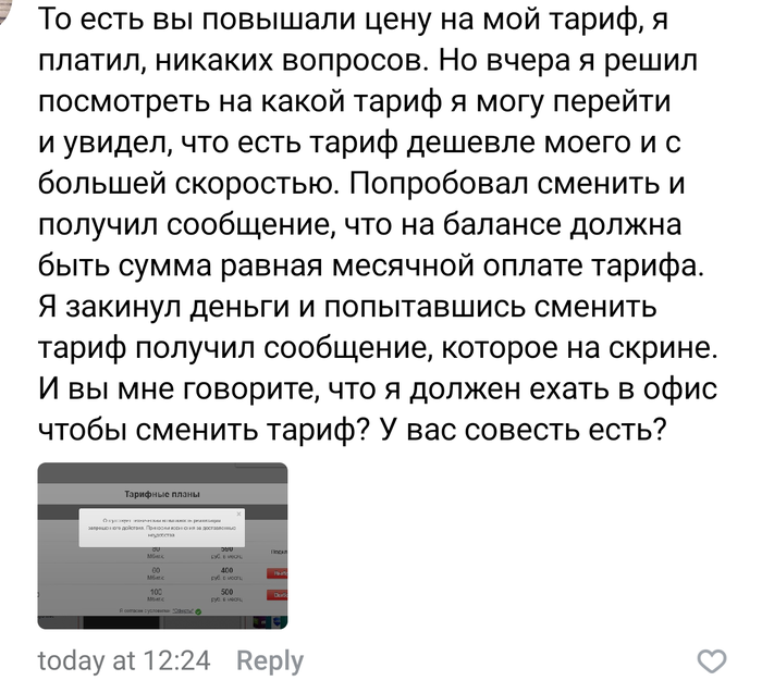Суть в том, что пользуюсь услугами данного провайдера уже давно. Насколько помню, изначальная цена моего тарифа составляла 490р. в месяц. В какой то момент цена стала расти, сначала вроде бы 550, а сейчас 590. Ну, я не возмущался и платил. Но вчера я зашёл в личный кабинет чтобы проверить баланс и решил нажать на кнопку смены тарифа, она и раньше там была, но я туда не заглядывал. Сказать, что я офигел - это ничего не сказать.