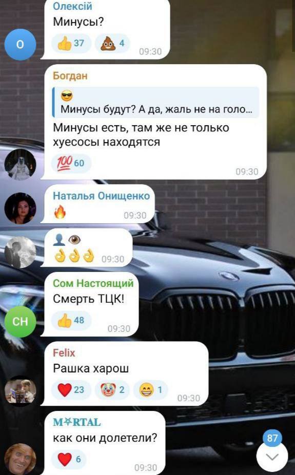 «На это можно смотреть вечно», «Необходимо, чтобы все ТЦК имели такой вид», «Это, наверное, за всех, кого там мучали», «Если Россия будет бить по ТЦК и блокпостам, то их армию будут встречать с караваями и цветами», — такие комментарии преобладают под публикациями об инциденте. Многие пользователи признают трагичность атаки, но называют её «кармой» для сотрудников военкоматов, которые «достали всех».