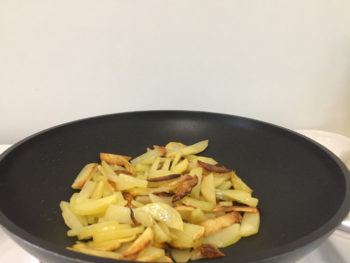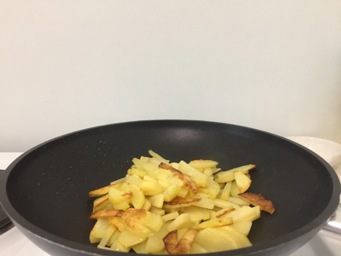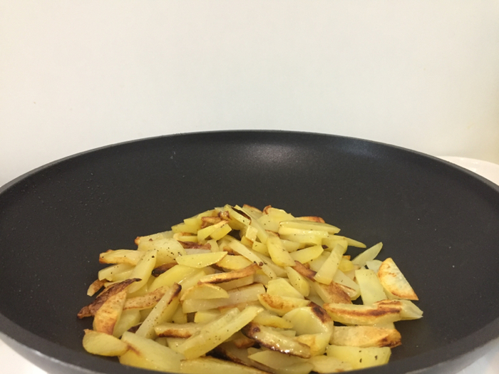 Вот, что мы получаем. Но не надо ничего делать. Ни солить, ни накрывать, не лезь к картошке.... отойди!!! Ещё на минут пять. Потом все повторится. Шкварчать будет как надо! Но надо продолжать. Прошло время, перестало шкварчать. И тут переворачиваем второй раз.