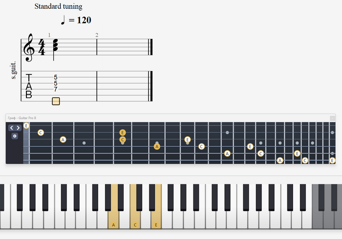 Окей, давайте возьмем Ля-мажор - та же ситуация. И ведь мы знаем, если сыграть этот аккорд в конце грифа - это один звук, а если в начале - совсем другой. И это главная проблема в отношениях гитарных дрочерят© с нотным станом - не интуитивно и не точно.