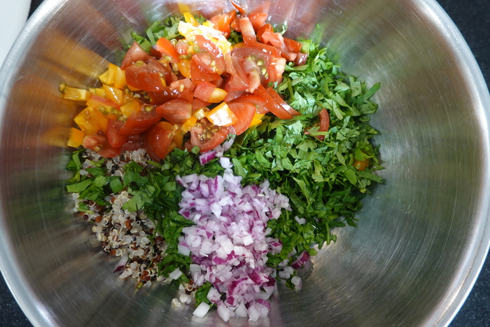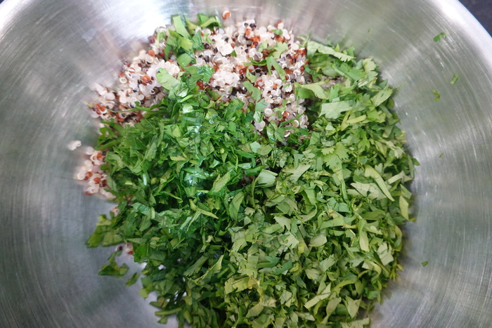 1. Отвариваем киноа как указано на упаковке. Мелко нарезаем зелень. Я взяла петрушку и кинзу. Можно взять еще мяту.