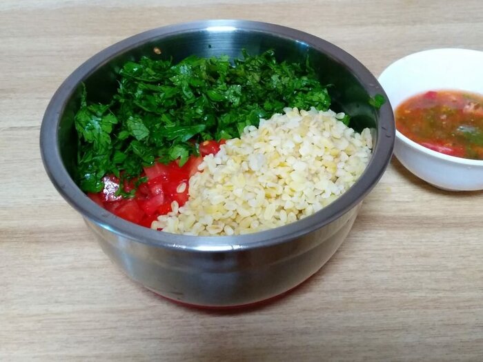 елень мелко нарубите. У помидор выньте семена и нарежьте мелким кубиком. Булгур (не забудьте промыть) замочите в кипятке, до размягчения. Смешайте с зеленью, томатами, лимонным соком, оливковым маслом, солью и черным перцем.