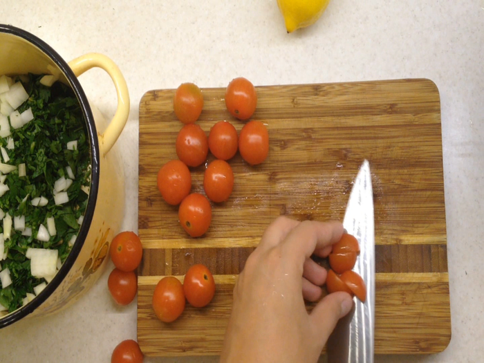 Нарезать перец и помидоры кубиками. Мелко нарезать петрушку, лук и мяту, если используете свежую.