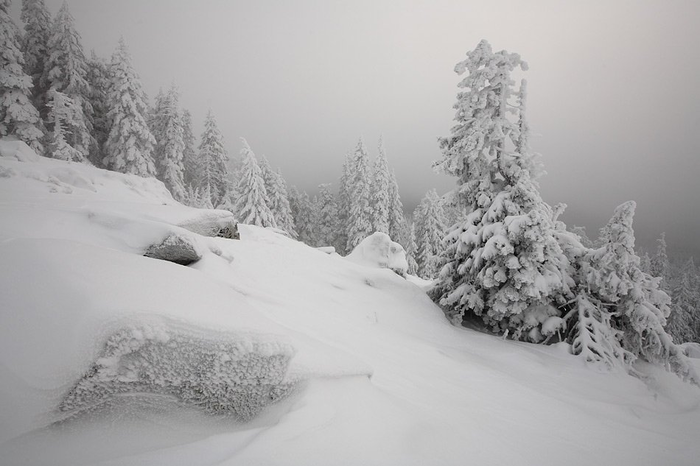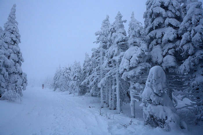 Лес внизу стоит чёрным. Почему-то только наверху на деревьях скапливается иней, нарастая в очень плотные образования. Я не очень понял физику процесса, но очень красиво. Как-то я оставил на улице фотоаппарат на штативе, и через час он стал уже не чёрным, а светло-серым. Ещё пара-тройка часов — и он бы стал неотличим от окружающей среды.