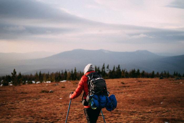 Накатанная лыжниками и снегоходчиками дорога на вершину горы Большой Таганай. Мы с рюкзаками шли очень долго и уже к вершине подходили в первых сумерках. Метель, дневной переход с 30 килограммовым рюкзаком, и заснеженный лес вокруг — что ещё нужно для счастья?