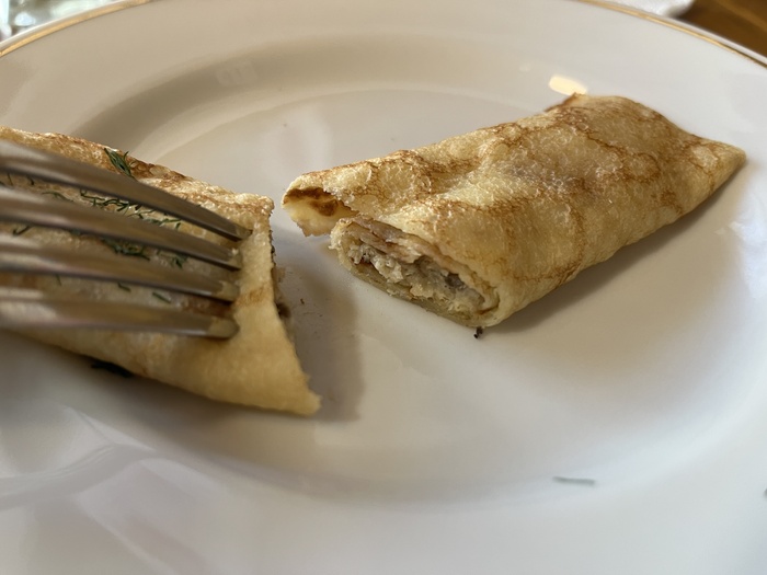 Тоже никогда не пробовал такое. По сравнению с незавёрнутыми блинами этот блин немного суховат, но начинка вполне интересна. Лично мне трудно определить на вкус, насколько эти грибы лесные, но самая комбинация яйцо-грибы-курица как-то сложилась.