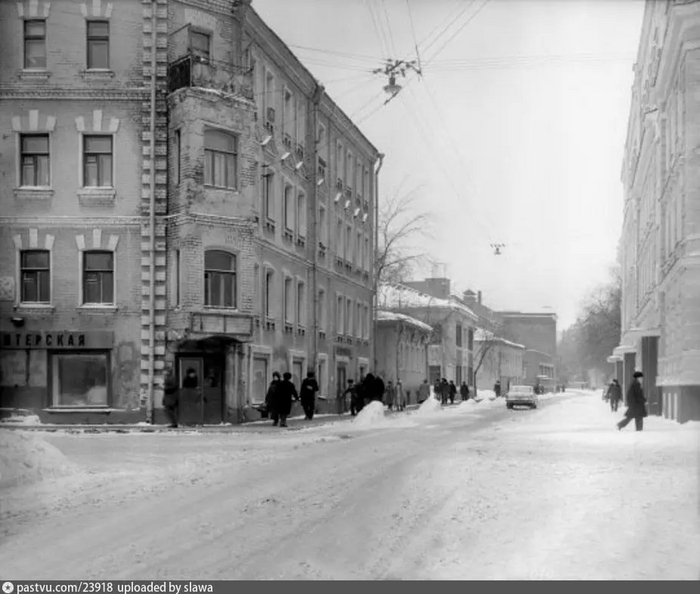 Товарищеский переулок в 1977 году. На переднем плане дом №22. Его строили в 1911-м, как училище. Сейчас тут располагается Городской методический центр. Автор фото: Ефимов. С сайта www.pastvu.com.