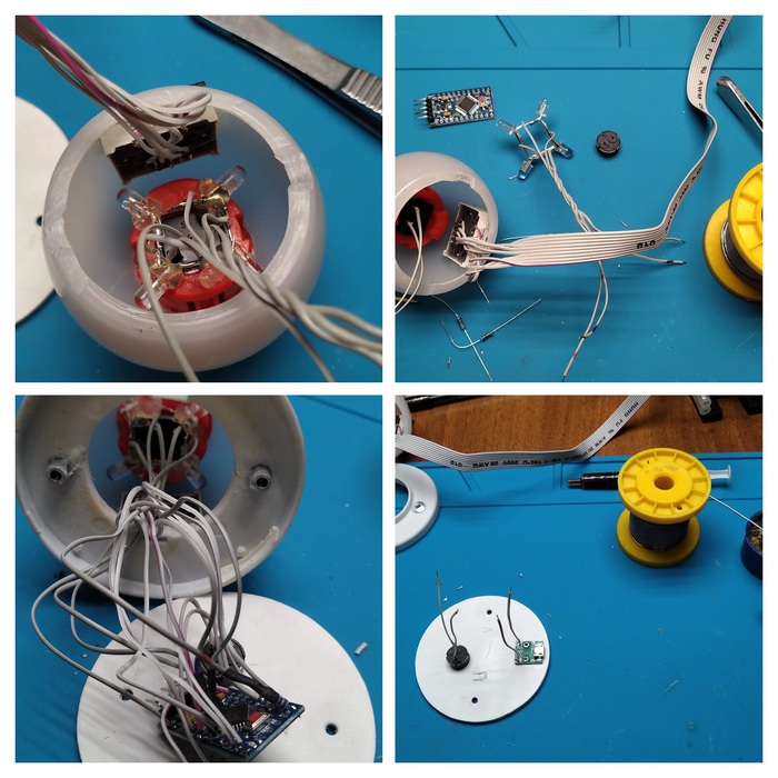 В лучших традициях DIY всё собрано на термоклей и суперклей, под пищалку просверлено отверстие в донышке. Управление одной кнопкой, одинарными, двойными, тройными нажатиями и удержанием.