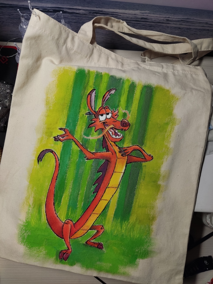 P.s. хоть одеждой я сейчас практически не занимаюсь, не так давно (недели две назад) расписала шоппер, на котором теперь красуется дракончик из мультфильма "Мулан" - Мушу🐲