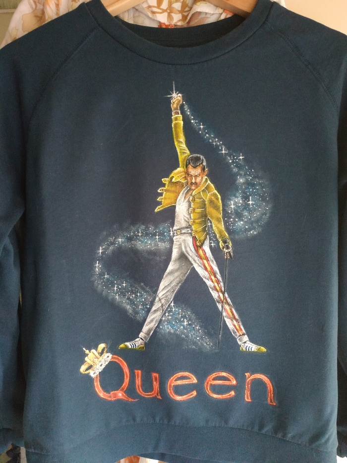 Сразу после подарочной футболки решила заняться чем-то для себя. Тогда, влюбленная в группу "Queen", задалась целью расписать худи с Фредди Меркьюри. И таков результат:) На работу ушло рекордных два полных дня (до этого укладывалась в день/полтора), но оно того стоило. Главная мечта - добраться в этом худи до Швейцарии, г.Монтре и увидеть воочию памятник Фредди в точно такой же позе, что и на росписи 👑