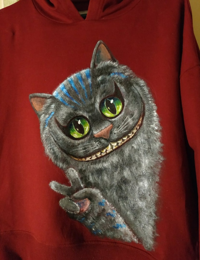 Одна из последних работ на одежде - Чеширский кот из "Алисы в стране чудес" для моей тети на День Рождения. Заказала сама тетя, ну а роспись делалась в тайне:) Буквально через две недели после празднования Дня Рождения случился карантин, так что Чеширец ждал своего часа и отмены локдауна.