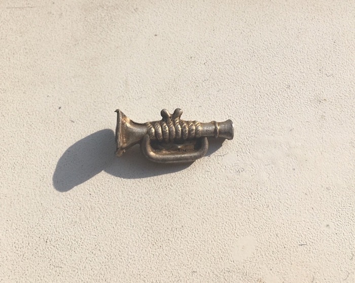 В этот раз тоже были весьма неожиданные предметы с довольно странным соседством. Под старым бревном я начал копать явно очень хороший плюсовой сигнал. Почти сразу выскочила большая водочная пробка, а затем вот такой мини горн. Вещица скорее всего серебренная ибо на ней нет ни каких окислов. Что это? Простая игрушка или часть какой-то композиции?