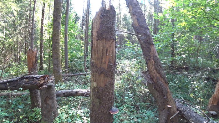 Углубляемся в чащу. Проходим около 6 км вдоль русла высохшей реки и тут я выхожу на странную поляну. Кругом деревья разбросаны как спички. Часть сломаны у основания, некоторые на уровне 1.5 метра. У большинства срезаны макушки. Такое ощущение, что здесь что-то давно упало с неба или был какой-то мощный взрыв. Обследую местность металлоискателем, но кругом тишина, лишь изредка земля фонит слабыми черметными сигналами. Как думаете, что здесь произошло?
