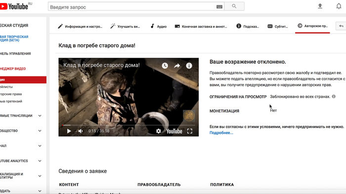 Сейчас я подал апелляцию, монетизацию восстановили почти на всех роликах, кроме первого видео с Мальдивских островов. Ролик с кладом в погребе старого дома видимо утерян на всегда. Хотя сейчас у меня появилась слабая надежда. Я обратился к грамотным юристам. Это маразм полный! Избили меня, сломали мне руку! Продолжают преследовать и при этом я должен тратить деньги на адвоката!!!