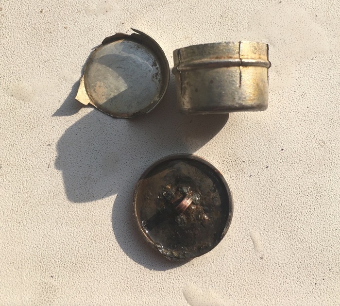 Недалеко от этого места небольшое болотце. Обхожу его по кругу и тут раздается приятный сигнал. Начинаю ковырять его, а он оказывается двойной и фактически лежал на поверхности. Непонятно каких годов пуговица. И странный мини контейнер, похожий опять же на детскую игрушку или маленькую пудреницу. Металл не понятен, но фактически без окислов. От времени предмет буквально рассыпается в моих руках.