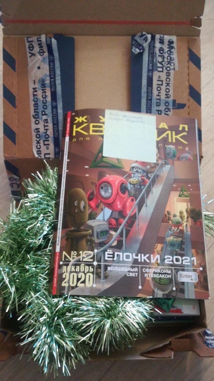 Получила я его к Рождеству 6 янв. Открыла и сразу увидела новогоднюю мишуру и первый подарочек - журнал Квантик. Я его уже прочитала - отдам племяннице - интересно придумали в журнале - конкурсы математические устраивать - собирают правильные ответы на их задачи, а потом объявляют победителей. Конкурсы ежемесячные, тут актуальный список конкурсов https://konkurs.kvantik.com/