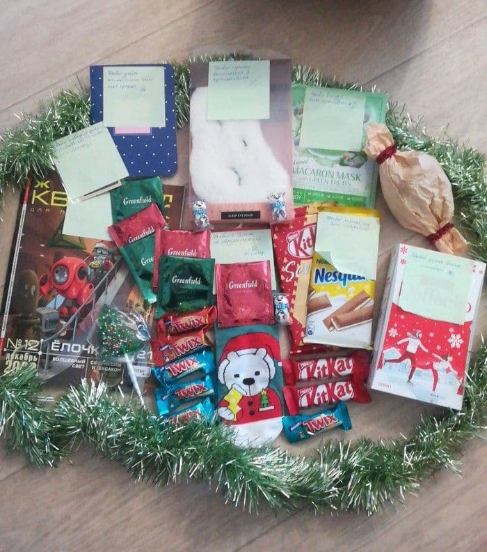 Подарки разложила, чтобы сфотографировать ( и как только уместилось столько в эту небольшую коробку почтовую).