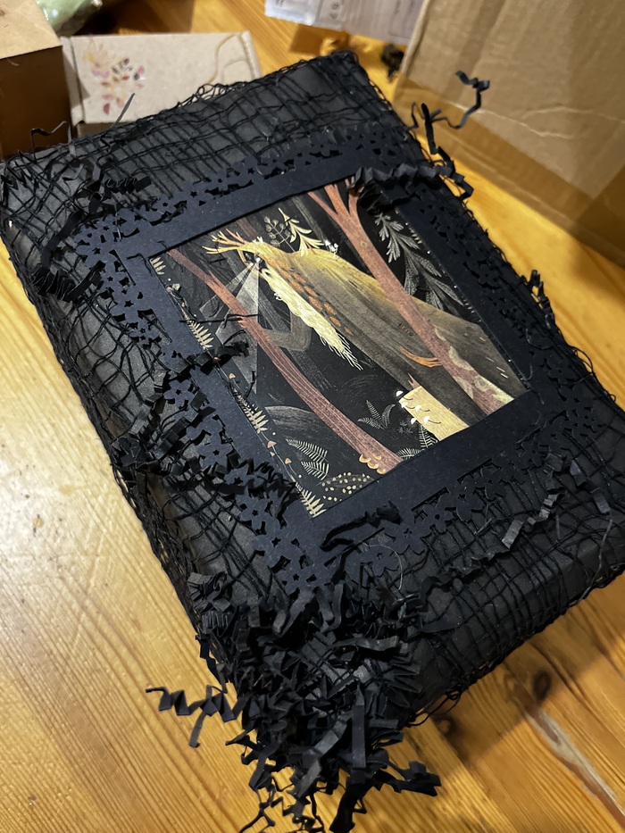 После всех моих восторгов, в посылке осталась ещё одна коробка просто дико круто оформленная и я, вся в предвкушении принялась её раскрывать. Это оказалось весьма непросто, так как она была опутана сетью, но я справилась)