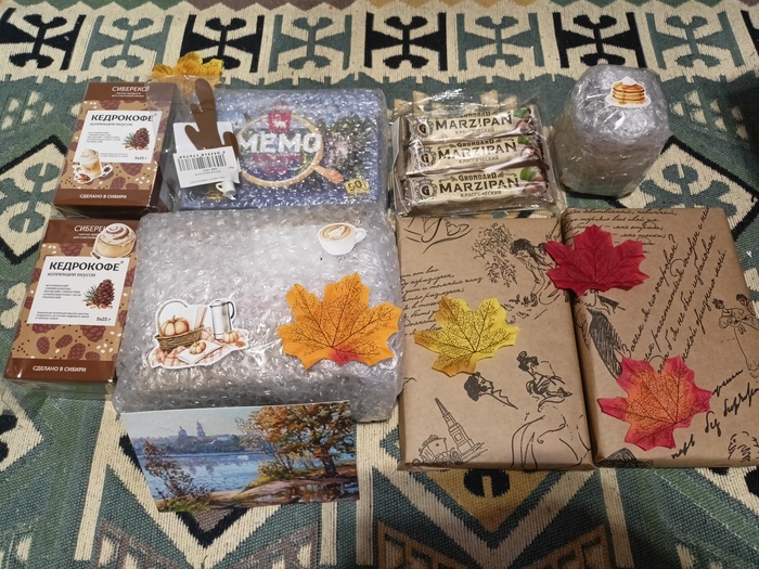Прямиком с Урала из города Верхняя Пышма приехала мне великолепная посылка от снегурочки Юлии! Я обожаю кофе, а также собираю всевозможные кружки. Поэтому даже сомневаться не пришлось об участии в этом уютном обмене. Моя снегурочка внимательно изучила мою анкету и со всей ответственностью подошла к наполнению посылки. В анкете я указала, что с детства являюсь фанатом вселенной Гарри Поттера, а также, что играем с семьей в настольные игры. Юля нашла настолку-бродилку по мотивам ГМ, с правилами которой нам теперь предстоит разобраться. Но мы справимся! Игра очень красиво исполнена, не терпится приступить к ней. Также моя снегурочка положила в посылочку вкусненький кофе и много полезных сладостей к нему. А я как раз в анкете писала, что обожаю белевскую пастилу и разные полезные сладости. Уральский Рыжик уже опробован - он великолепен! Фруктовые батончики просто пальчики оближешь. Вот сижу пью кофеек и жую батончик! Вкуснейшие конфетки с сухофруктами и орешками пока ждут своей очереди, но думаю недолго они будут лежать без дела :) Ну и гвоздь посылки - великолепная осенняя чайная пара!