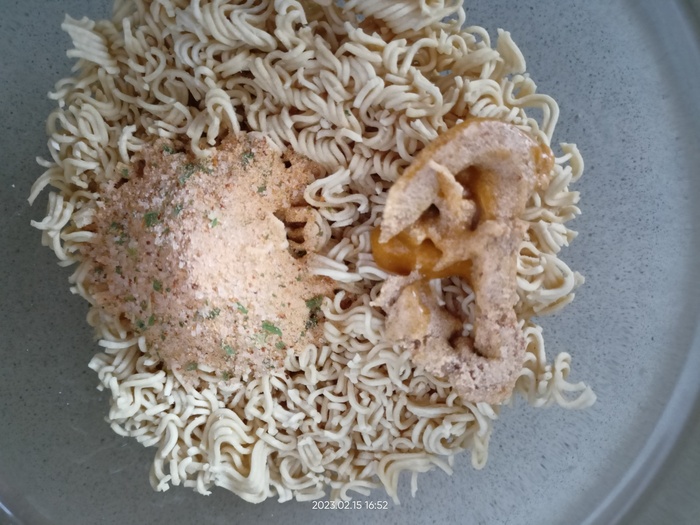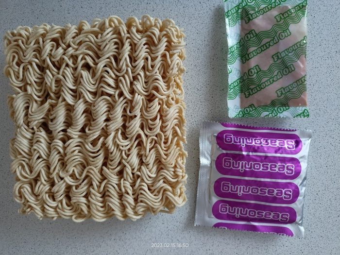 В пачке квадратная, довольная большая лапша. Судя по запаху поджаренная. И 2 пакетика с приправой: в одной порошок, вторая полужидкая с ярким вкусом лемонграсса.