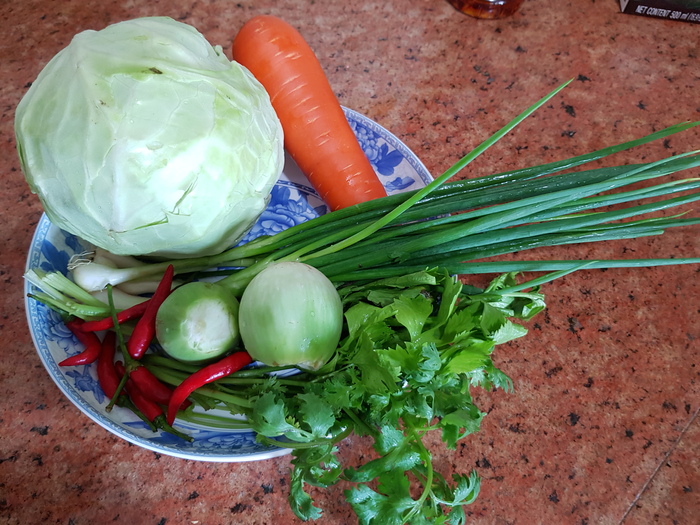 Вот как из простых продуктов и не-простых специй можно вызвать напоминание об отпуске или приподнять настроение к очередному: необходимо запастись куриным мясом (любая часть курицы),  Зеленью и овощами (капуста, морковь, петрушка, кинза, жгучий перчик, чеснок, лук репчатый, баклажаны - на любителя), Кокосовым молоком, рыбным соусом и сухой приправой «грин карри» и, вдохновившись, твОрить или твАрить.