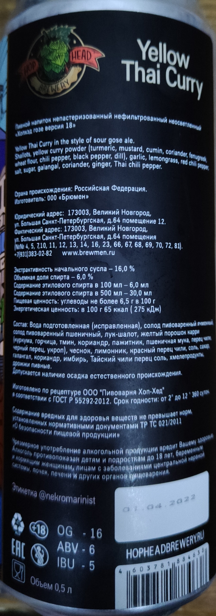 Thai Yellow Curry от Hophead - пиво сварено в стиле Гозе суп (Gose Soup).