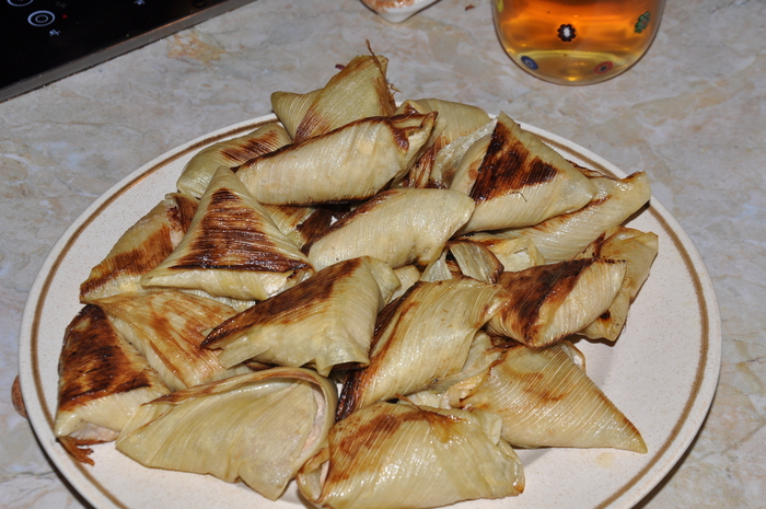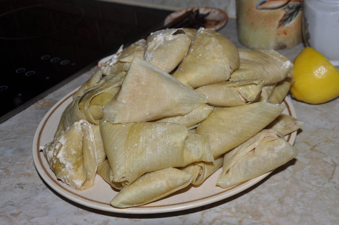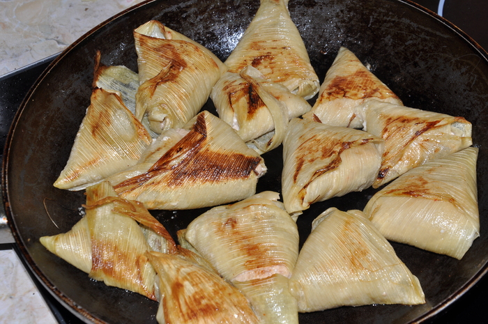 Заворачиваем в треугольники из листьев, складываем в кастрюлю, заливаем кокосовым молоком, добавляем помидоры, бадьян, корицу. Через 20 мин вытаскиваем и обжариваем.