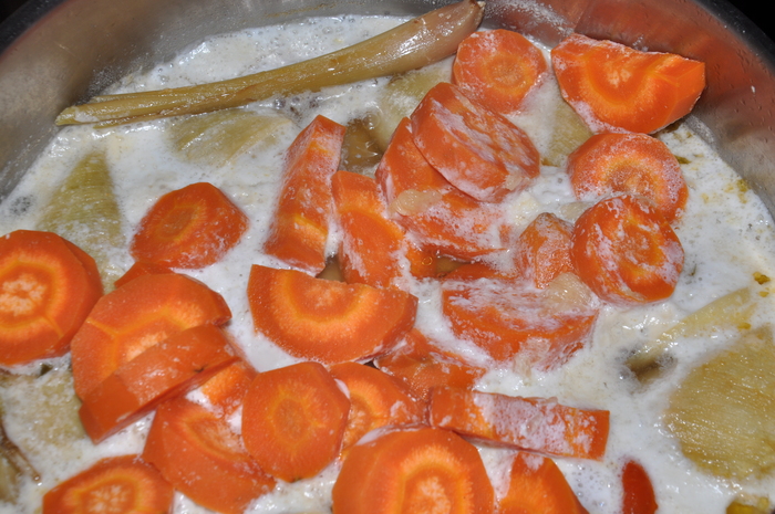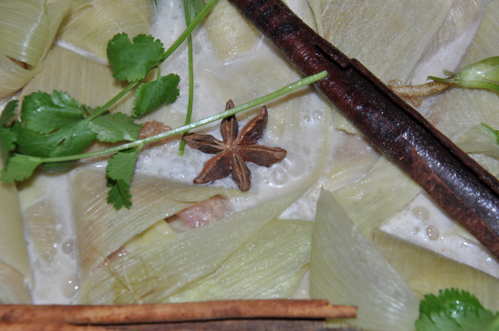 убираем черешки из листьев каффир-лайма (3 листочка) и добавляем все в кастрюлю