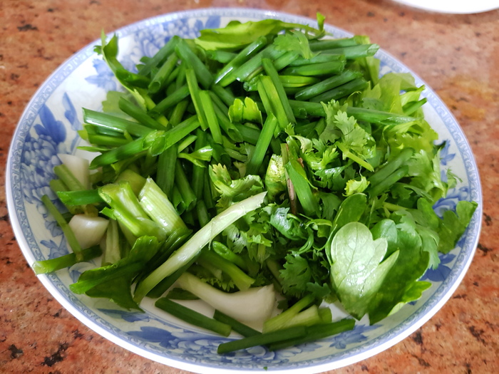 Шампиньоны, коричневые или белые, 500 г, порезать так, как Вам нравится. Куриное филе, грудка или выкостненое бедро 500 г, порезать коротко и тонко. Мелко порубить 2 головки салата пакчой - примерно 250-300 г или 300 г китайской капусты. Подготовить 250 г мелких вареных креветок - должны быть очищенные. Порезать полукольцами одну белую луковицу и 150 г помидоров черри на четвертинки. Порубить зелень - петрушка, базилик, ту, что любите.