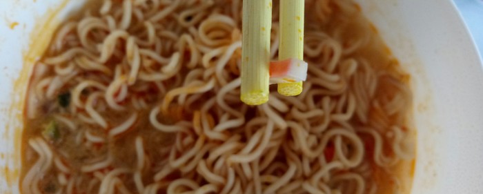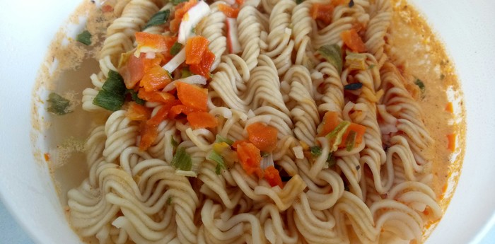 Эта лапша очень хорошо держит форму, остаётся упругой и прочной. При этом она прям впитала бульон, ибо у самой лапши тоже есть его кислосладкоострый вкус. Здесь много овощей, и морковка прям морковного вкуса. А околокрабовые штучки, хоть и плохо жуются, на вкус - вполне себе околокрабовые.