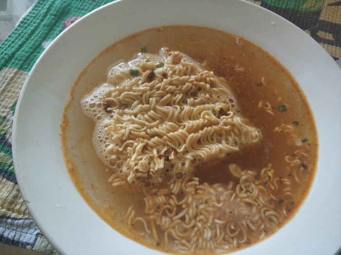 Пока она заваривается, я думаю о том, как же это круто, когда надо просто высыпать содержимое всех пакетиков и залить кипятком. Доширакоделательная промышленность разных стран понапроизводила целую гору лапши, которую надо варить, сливать, смешивать, добавлять соус после заваривания или даже греть в микроволновке. И я, если честно, слегка устал уже от этого всего. А тут всё просто, как в "Роллтонах" и "Дошираках" - любимый со студенчества ритуал. Только ещё есть офигенная пластиковая миска.