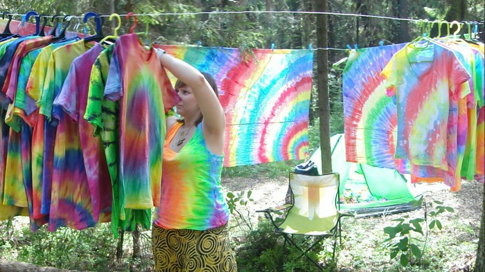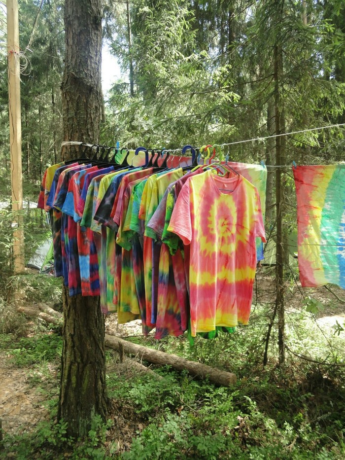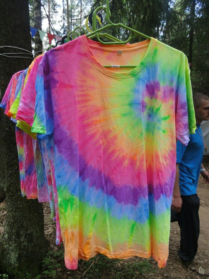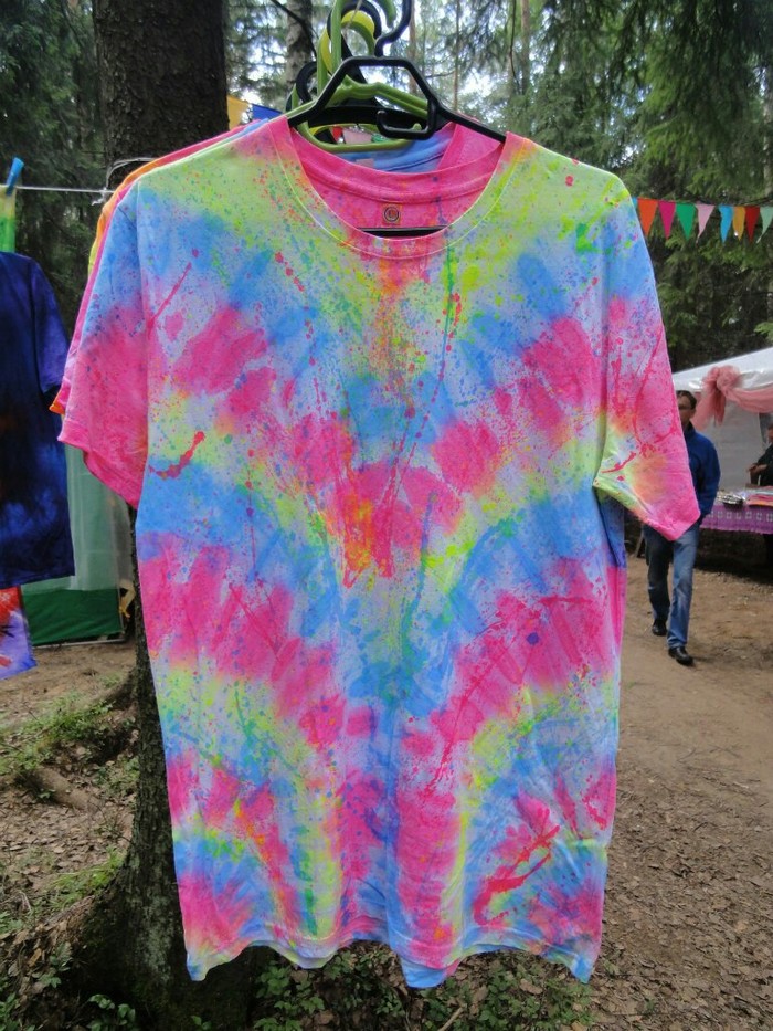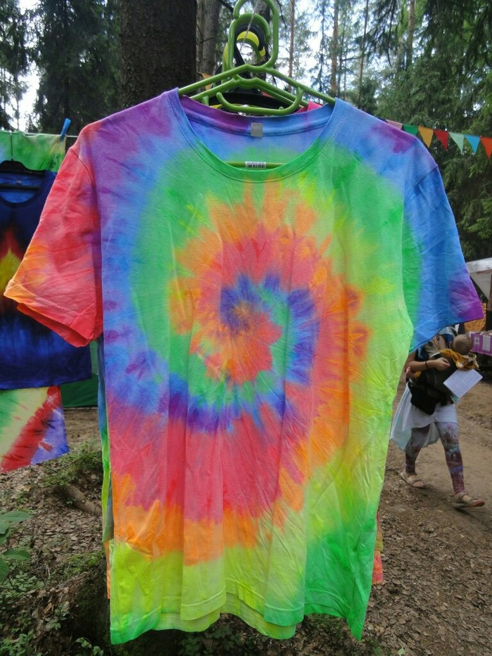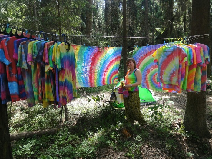 Разложились (точнее развесились), сидим, ждём покупателей. Мы были не одни такие, приехала ещё одна семья тай-дайщиков. Опытные, бывалые, подготовленные. Я знала, что они будут, пересекалась с их творчеством когда читала про фестиваль за предыдущие года. Но честно признаюсь, было немного не по себе.. немного сильно не по себе.. Всё же, всё, что там (на этом фестивале) происходило немного не наша стихия. Да, атмосферно, да, очень много разных интересных людей, есть что посмотреть, но вот как-то это всё не вписывалось в наш повседневный ритм жизни. Но иногда выходить из зоны комфорта очень даже полезно :) Поэтому я себя настраивала на позитив как могла. И позитив к нам пришел, но не сразу.. к вечеру народ пригляделся что и где и начал подходить. Начали покупать! Ура! :) Светящиеся в ультрафиолете шли лучше всех (там ночью дискотека с ультрафиолетовыми лампами)