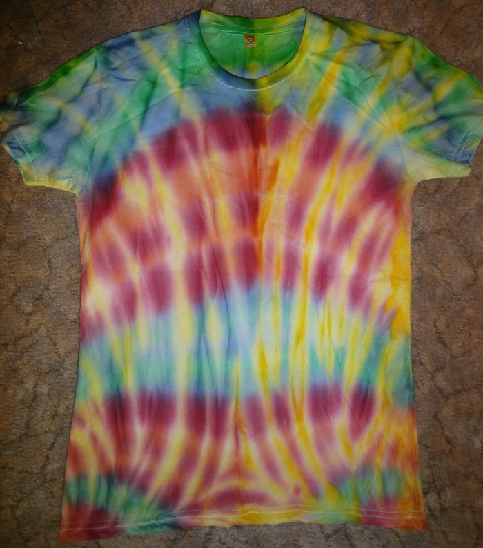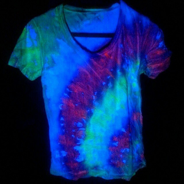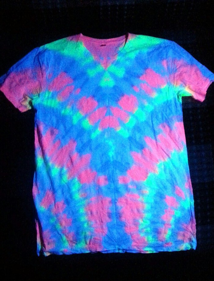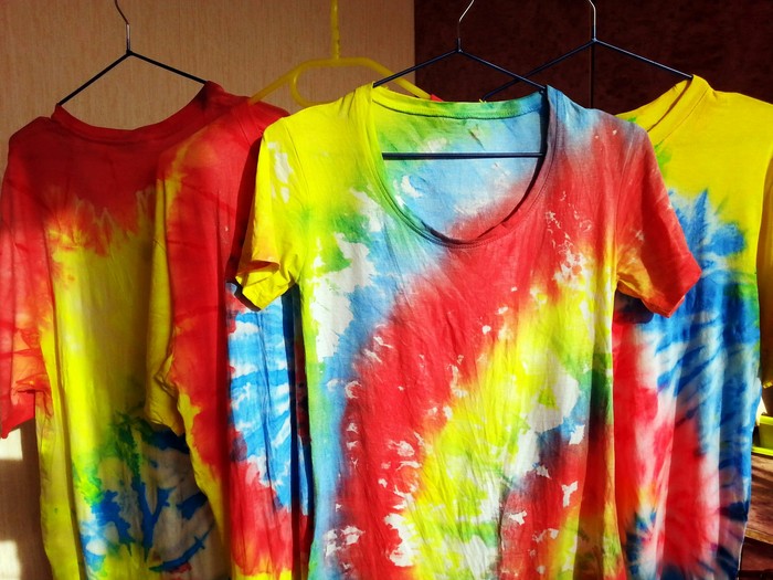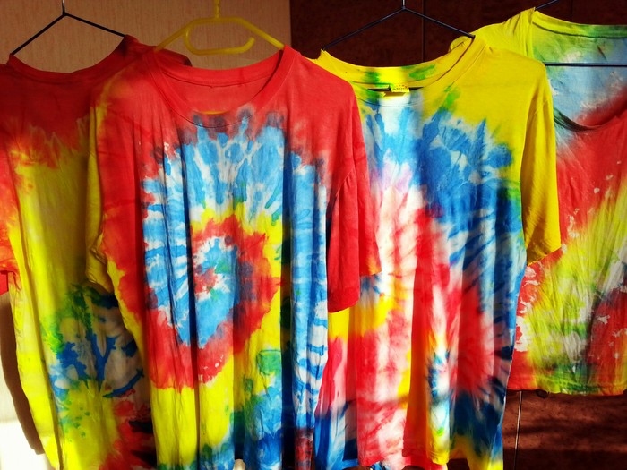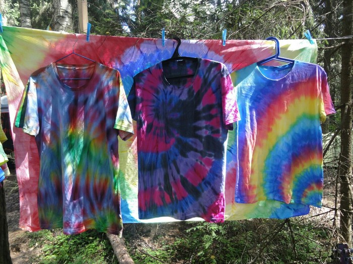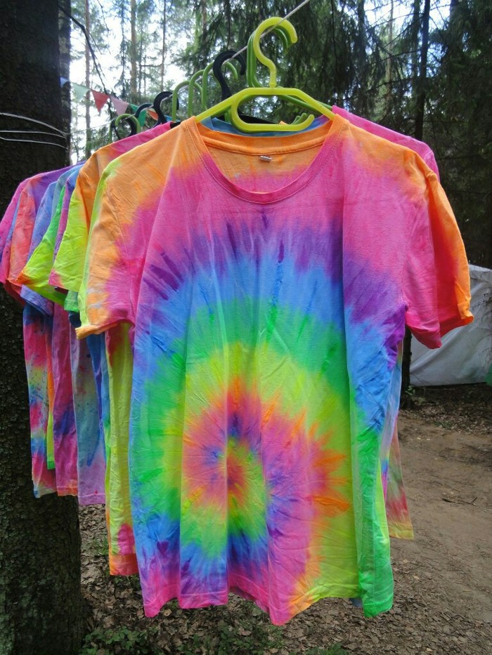 Разложились (точнее развесились), сидим, ждём покупателей. Мы были не одни такие, приехала ещё одна семья тай-дайщиков. Опытные, бывалые, подготовленные. Я знала, что они будут, пересекалась с их творчеством когда читала про фестиваль за предыдущие года. Но честно признаюсь, было немного не по себе.. немного сильно не по себе.. Всё же, всё, что там (на этом фестивале) происходило немного не наша стихия. Да, атмосферно, да, очень много разных интересных людей, есть что посмотреть, но вот как-то это всё не вписывалось в наш повседневный ритм жизни. Но иногда выходить из зоны комфорта очень даже полезно :) Поэтому я себя настраивала на позитив как могла. И позитив к нам пришел, но не сразу.. к вечеру народ пригляделся что и где и начал подходить. Начали покупать! Ура! :) Светящиеся в ультрафиолете шли лучше всех (там ночью дискотека с ультрафиолетовыми лампами)