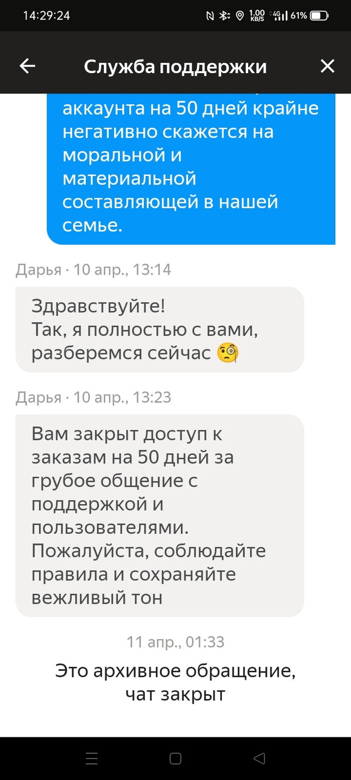 P. S. Забыл сказать, что все сообщения о том, что "продолжаете невежливо общаться с сотрудниками поддержки или пользователями", приходили только после общения с техподдержкой, когда твоё обращение туда так и не решилось и в конце чата ставишь единицу оператору техподдержки и указываешь причину оценки (ответ не на мой вопрос, слишком общий ответ, вопрос не решили и что-то там ещё не помню))