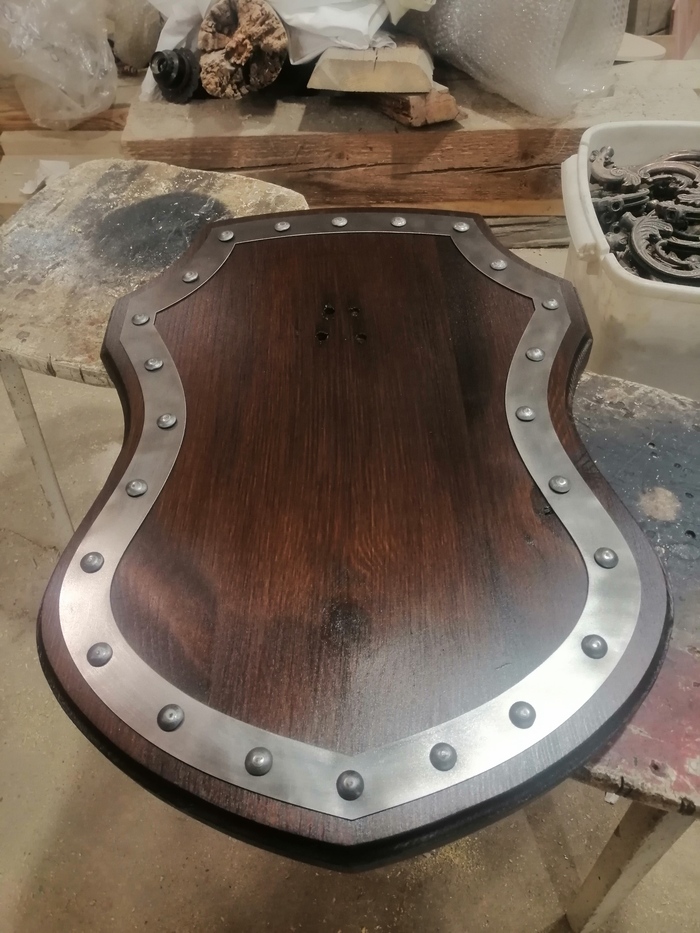 "Дерево, полосы металла и заклепки" - так звучала наша концепция! А форма геральдического щита просилась сама собой.