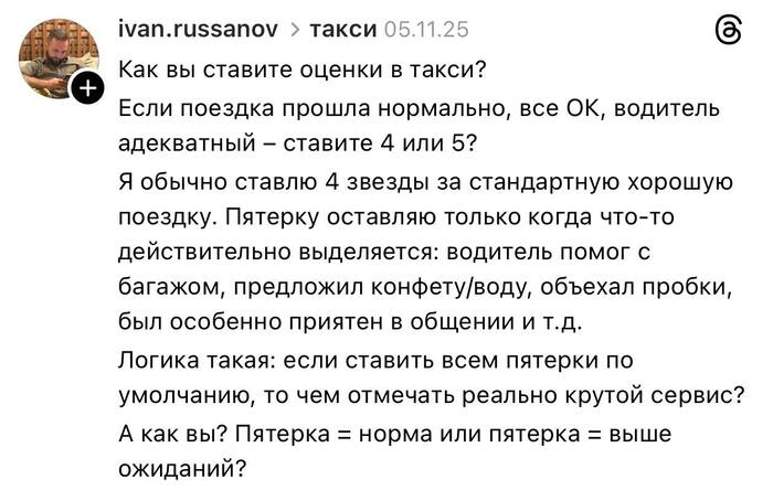 В очередной раз увидел эту тупейшую шутеечку на тему: "Вот бы хирург отказывался оперировать таксистов со словами: слишком сложная операция, не хочу за это браться". Товарищи, хирург в больнице получается ЗАРПЛАТУ, и на его заработок никак не влияет, кого именно ему дадут оперировать, и сколько операций за день он выполнит. Он может сложного пациента 12 часов оперировать, и его зп не будет меньше того коллеги, который за эту же смену прооперировал, допустим, четверых. А у таксиста его доход напрямую зависит от того, какие заказы он берет. И если вы хотите уехать в пгт. Тмутараканье, и водитель знает, что он с вероятностью 99% оттуда будет ехать назад в город пустым, то естественно откажется от заказа. У меня есть знакомая, которая закладывает утром час, чтобы уехать на работу в пригород, до которого вообще-то ехать 20 минут максимум. И злится, что такие-сякие таксисты утро ей портят, так бы она могла поспать на полчаса больше. Я ей сказал на возмущения её: "А чего ты машину-то не купишь?" На что она резонно отвечает: "Дорого!" Ну я ей и возразил, что таксисты тоже умеют считать деньги, не только она. В ответ пробухтела что-то невразумительное. Такие дела.