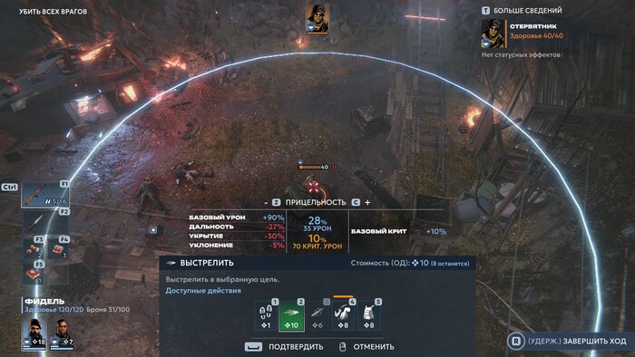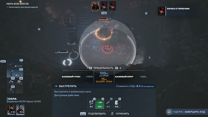 Что мне очень понравилось — любое действие подробнейшим образом описано. Например, планируем перебежать за укрытие. При этом показывается, сколько ОД ещё останется. Можно спланировать следующее действие. Если атакуем, то видны все параметры этой атаки и так далее.